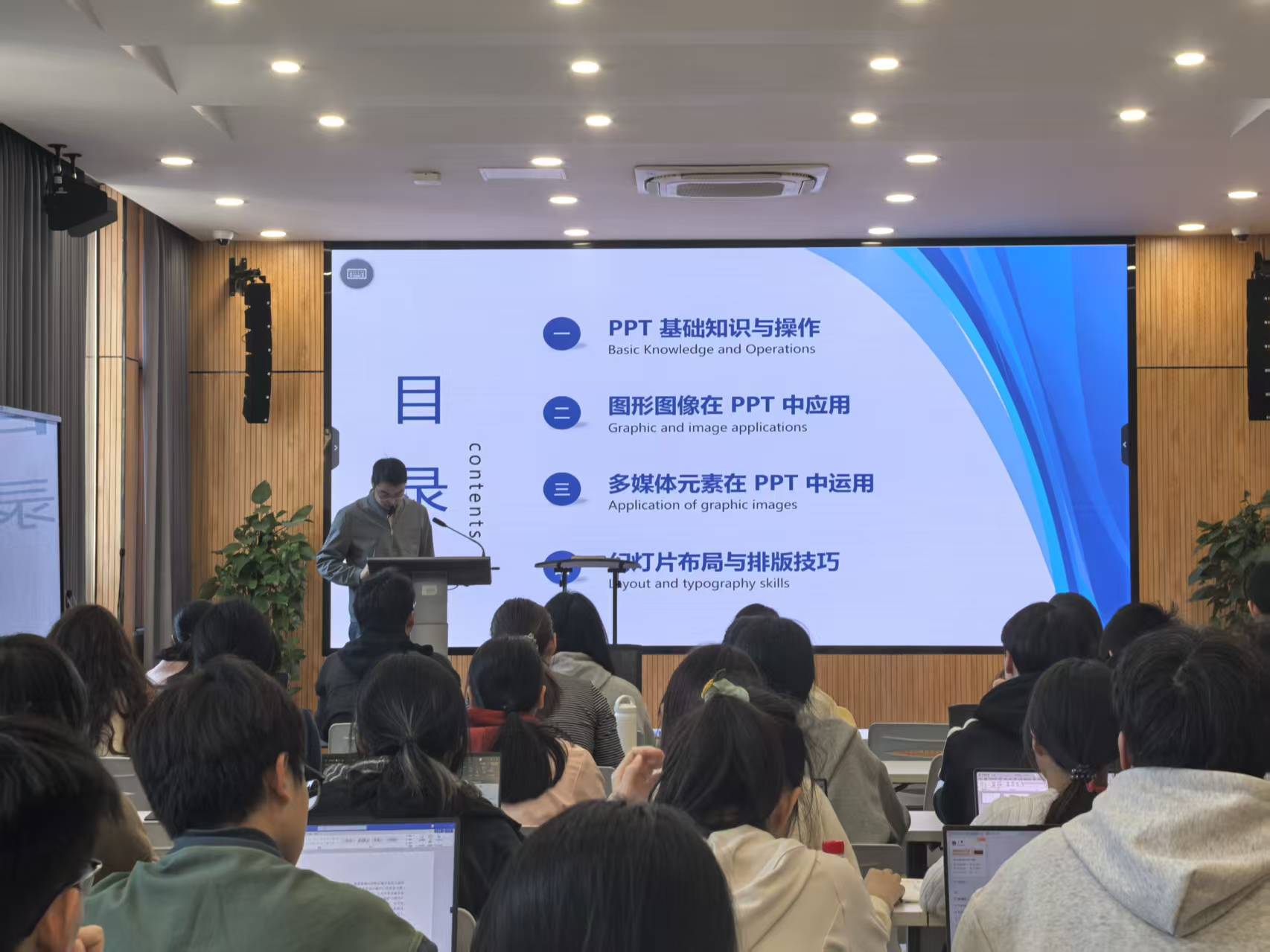 仪式结束后,团课第一课正式开始。本次课程特邀信息科技与工程学院黄栋栋老师以“团学PPT制作入门培训”为主题授课。黄老师从“PPT基础知识与操作”、“图形图像在PPT中应用”、“多媒体元素在PPT中运用”、“幻灯片布局与排版技巧”四个层面出发,深入浅出地分享了PPT制作的核心要点。授课过程中,他结合团课汇报、活动总结等团学工作实际场景,通过案例对比、实操演示等方式,拆解PPT制作中的常见问题与优化技巧;同时邀请学员上台实操演练,并根据现场操作情况进行针对性指导,内容兼具实用性与针对性。