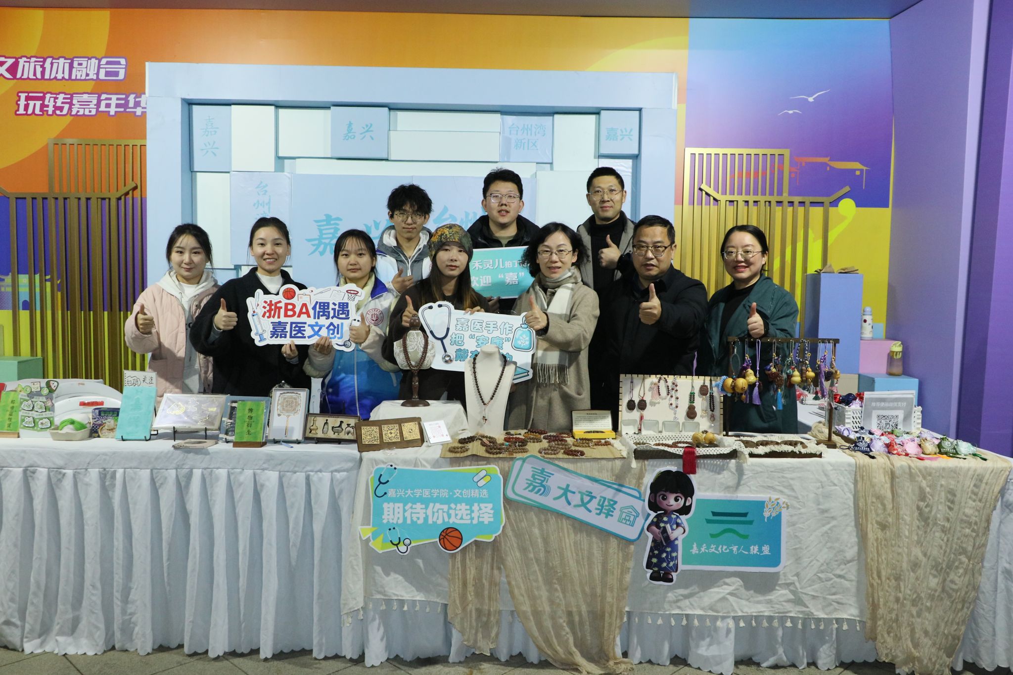 医学院党委副书记朱莹带领辅导员团队全程组织协调,嘉兴大学副校长张琦、创新创业学院院长黄风立亲临现场指导,与同学们亲切交流,详细了解各类文创产品的设计理念与制作过程。