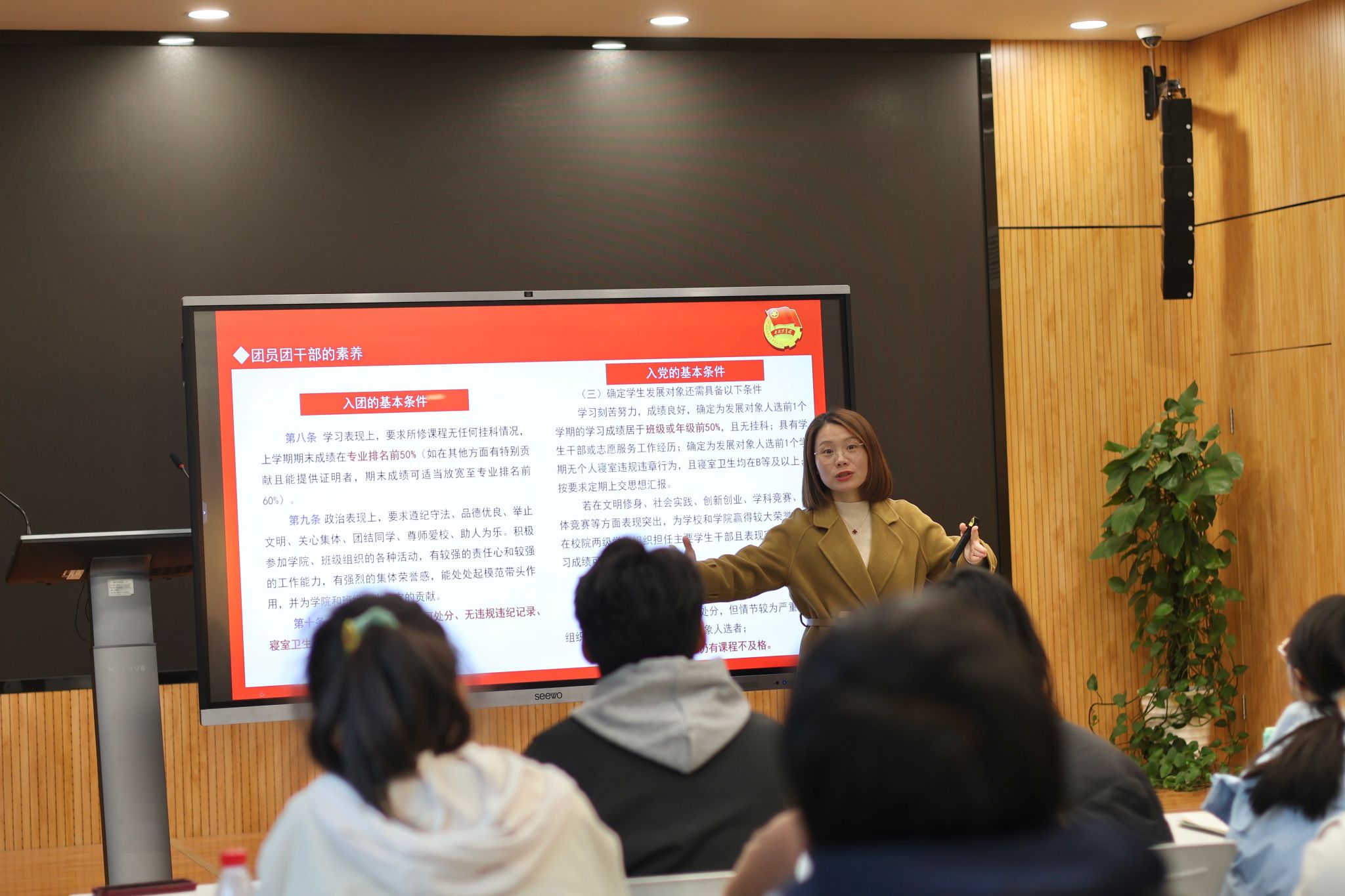 最后,庄怡老师围绕“修素养”主题,详细阐述了合格团员及团干部应具备的基本素养。她首先明确了加入共青团的基本条件,进而将视角延伸,对比讲解了申请加入中国共产党的基本条件,剖析了团员作为党的后备军,应如何以党员标准为参照,不断提升思想政治觉悟、道德品质和实践能力,为学员们指明了努力方向。