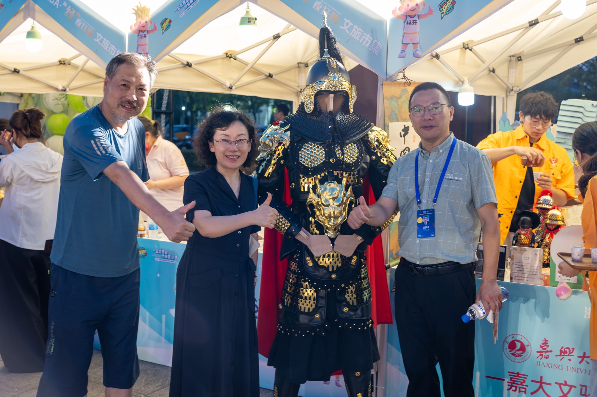 市集现场,设计学院学子积极担当文化宣讲与创意推广角色,交流气氛热烈。嘉兴大学党委委员、副校长张琦,创新创业学院院长黄风立亲临指导,并慰问参展同学。
