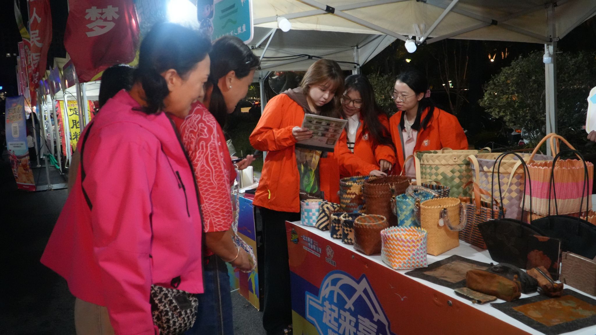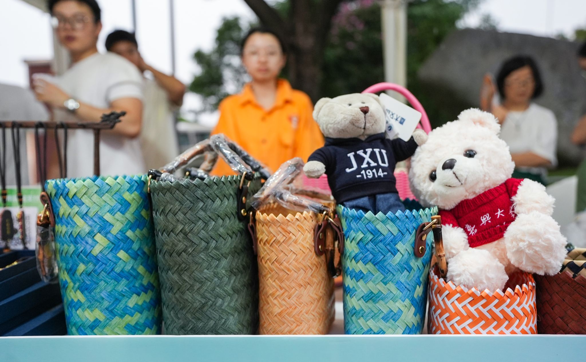 作为嘉兴市文化特派员,视传专业张新克老师不仅在校开设第二课堂指导学生学习非遗竹编技艺,还组织学生将社区居民亲手制作的竹编笔筒、手提包等作品带至市集进行义卖,实现“社区传承—高校传播”的双向赋能。同学们热情讲解每件作品背后的工艺故事与文化内涵,非遗手编包吸引了不少观众驻足欣赏,大家纷纷感叹传统手艺竟能以如此新颖实用的方式焕发生机。参与该项目的学生林圣萍表示:“在这个过程中,我真切感受到了文化传承的使命和价值。”