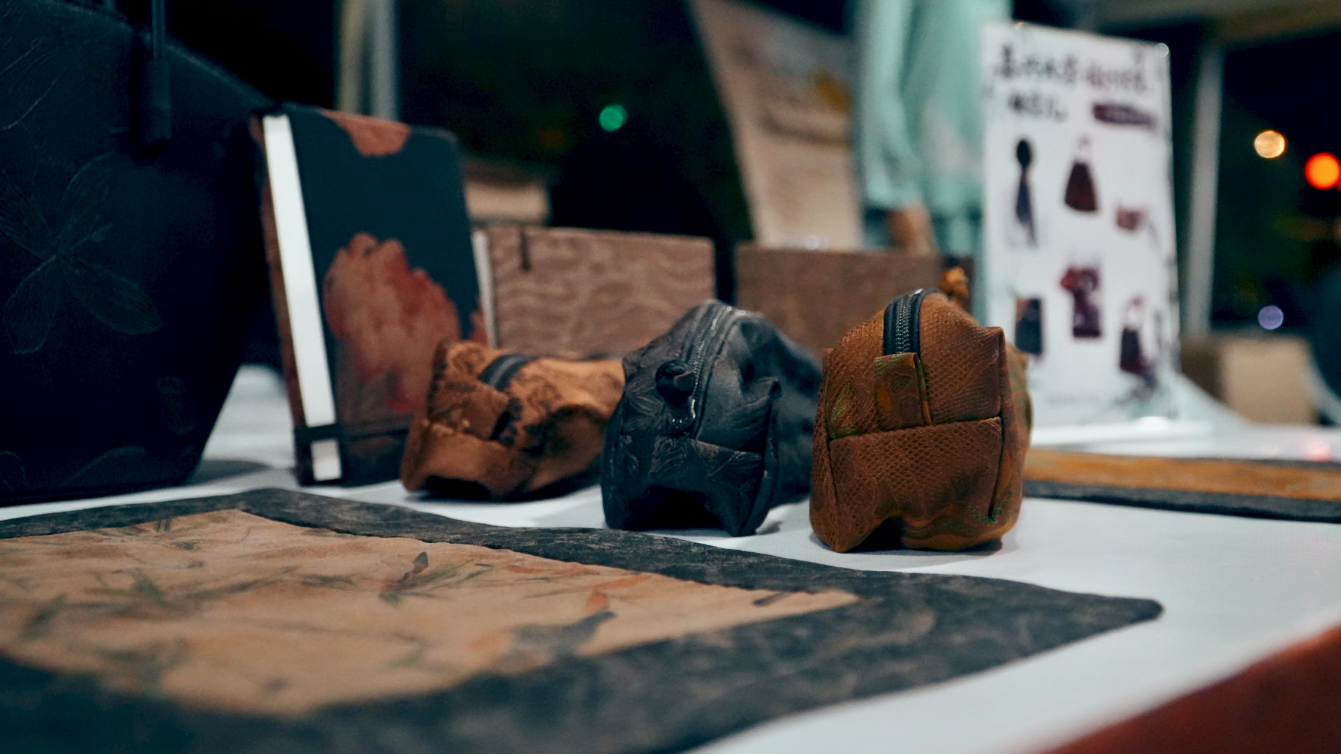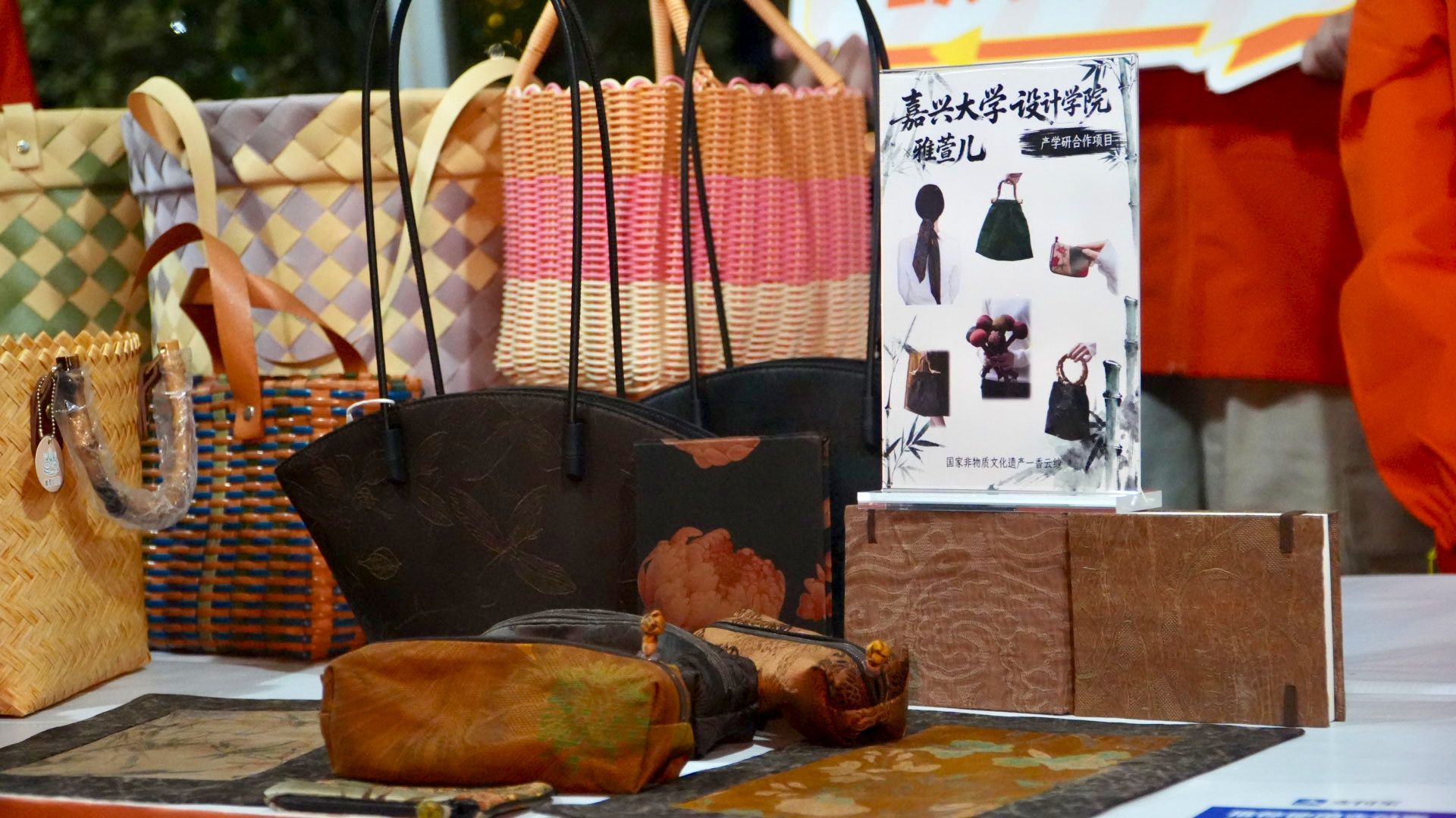 服装专业一叶工作室带来的校企合作展区,陈列着嘉兴大学设计学院与雅萱儿品牌的产学研合作成果。一系列以香云纱、宋锦、苏罗等非遗面料精心制作的产品,将传统面料融入当代配饰设计,让非遗技艺以更贴近现代审美与使用习惯的方式焕发新生。现场许多市民被其细腻质感与东方雅韵所吸引,纷纷赞叹传统工艺在现代美学中所绽放的独特魅力。
